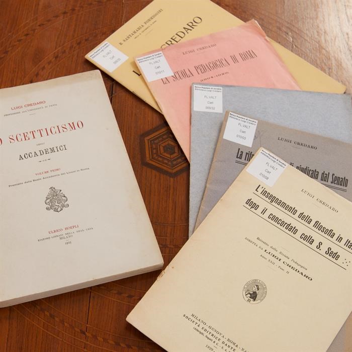 Di quest’ultimo, professore, preside e Provveditore agli Studi di Sondrio, si conservano le bozze dattiloscritte delle principali opere e, tra gli altri documenti autografi, un progetto di riforma della scuola primaria in provincia di Sondrio nell’immediato secondo dopoguerra.